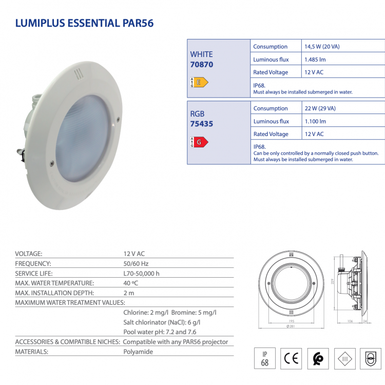 Con el proyector LumiPlus Essential PAR56 LED de AstralPool mejorarás de forma sustancial la luz de tu piscina, reduciendo el consumo drásticamente.